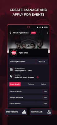 Fight Scout offers fans an immersive experience into the global combat sports world. Search for events by location, type of combat sport or specific dates. Receive notifications on the promotions or fighters you follow, buy tickets for live shows or watch them live on your mobile device and get all the relevant information on a single screen.