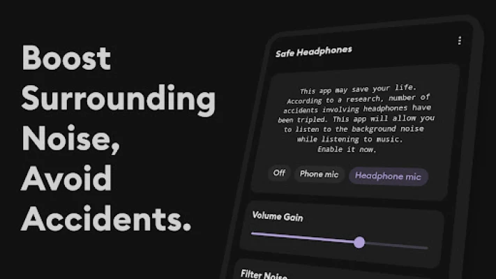 Safe Headphones let you hear your surroundings while wearing your headphones. It will amplify the sound and enables you to hear clearly.